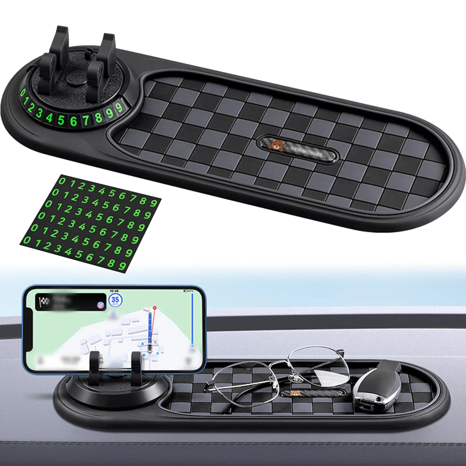 4-in-1 Multifunctionality: This versatile car dashboard mat combines a non-slip pad, a phone holder, and storage for keys and sunglasses, keeping your essentials organized and easily accessible during drives.